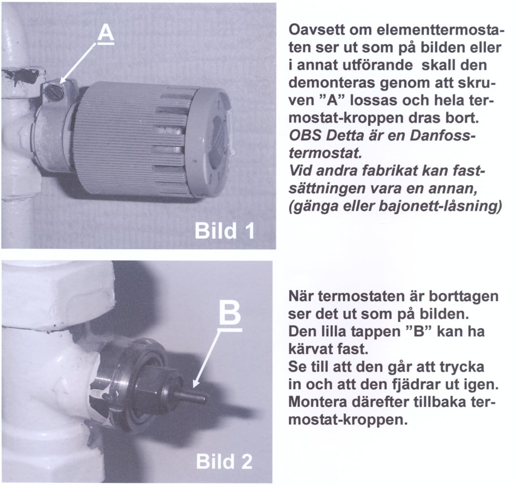 Jag har försöket att dra värme från bild 1 element 1 till en annan. Om du inte får stiftet att röra sig eller det är fortsatt varmt i rören men kallt i termostaten så får du byta en del av ventilen packboxen. Du har kopplat radiatorerna parallellt.
